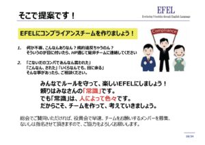 懇親会に先立ち、コンプライアンス委員会について、委員長である松井さんより趣旨説明がありました。常識は人や地域、国によってもさまざまです。だからこそ、法令に基づいた運営が重要となってきます。そのために、コンプライアンス委員会を作って、EFEL内に問題がないかなど、皆さんと一緒に考えていくことになりました。どうぞご理解とご協力をお願いいたします。